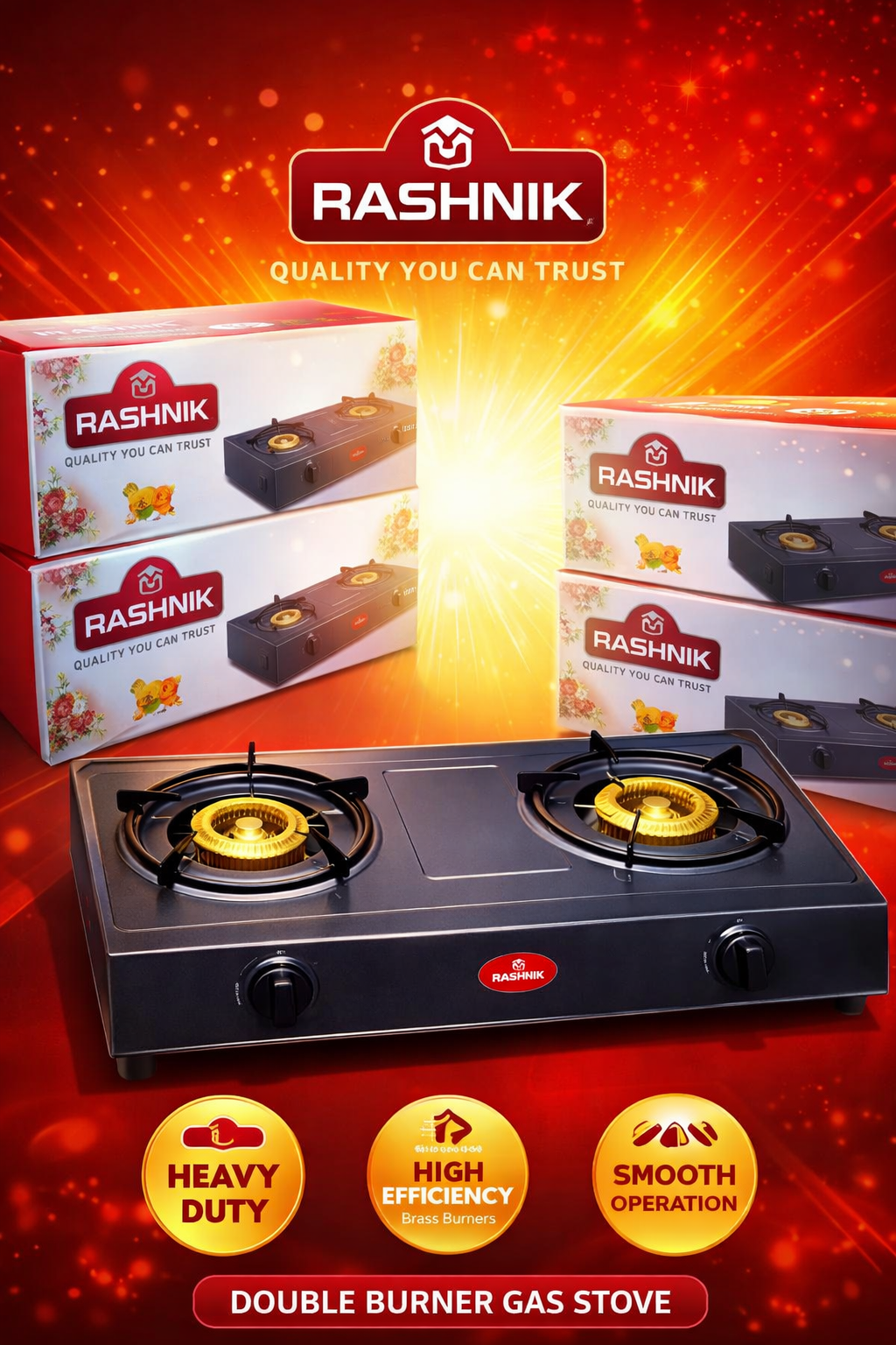 Upgrade your kitchen experience with the RASHNIK Double Burner Gas Stove, designed for durability, efficiency, and everyday convenience. Built with a strong body and high-quality materials, this gas cooker delivers reliable performance for both home and commercial use.